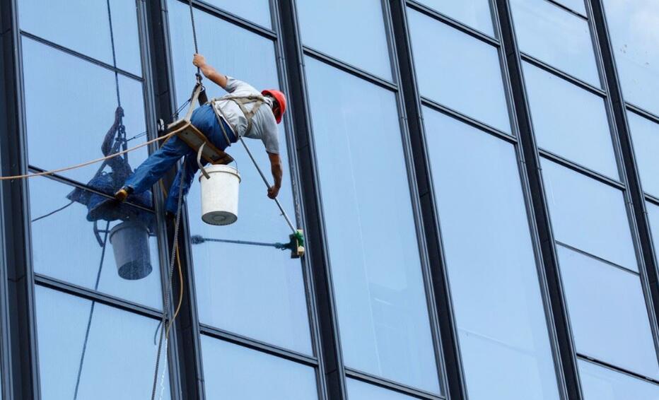 我們除了采用傳統(tǒng)的清洗座板,安全繩比普通吊繩厚度高出2mm以外,還會(huì)根據(jù)現(xiàn)場(chǎng)的實(shí)際情況,采用吊籃和曲臂吊車,以此來保證清潔效率以及保障施工人員的安全問題。